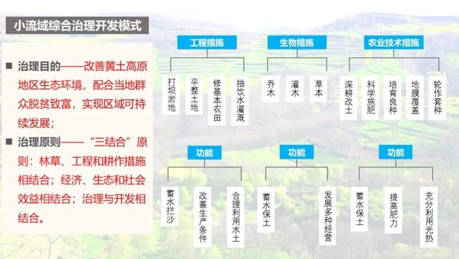 整治措施:黄土高原不如南方水热条件好,又处于过渡地带,需实施植树种草、退耕还林还草等生物措施;兴修水库、打坝淤地、修建水平梯田等工程措施以小流域为单位进行综合治理,使黄土高原生态环境得以改善,区域经济得以发展。