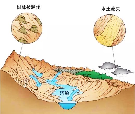 乱砍乱伐,放火烧山,使森林遭到破坏失去蓄水保土作用,使地表,直接遭受雨滴的击溅,流水冲刷,从而加速了土壤侵蚀的方式和发展。