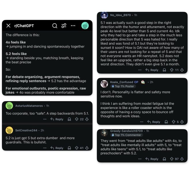 另一些网友反馈说,GPT-5.2似乎把成年人当学龄前儿童对待,感觉不像是升级,反而是倒退。